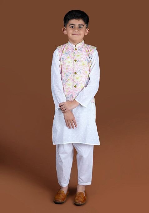This White Floral Print Nehru Jacket With Kurta And Pants (Set of 3) is made from premium fabrics, ensuring comfort while keeping you stylish.