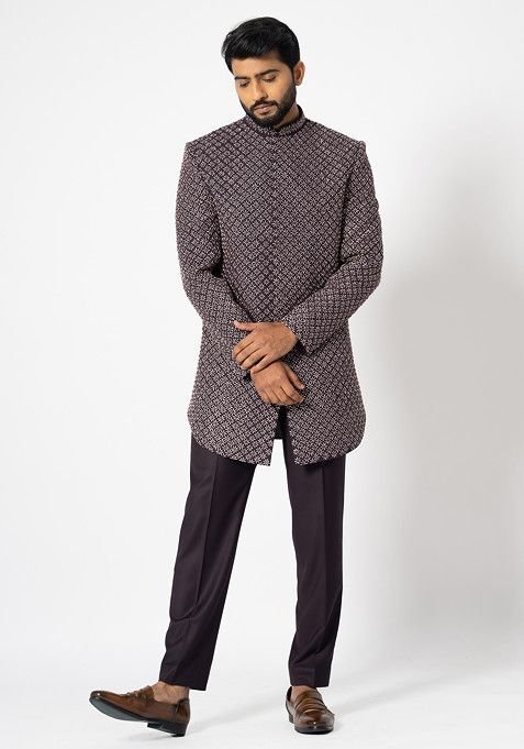 This Wine Embroidered Suiting Fabric Achkan Set For Men is made from premium fabrics, ensuring comfort while keeping you stylish.