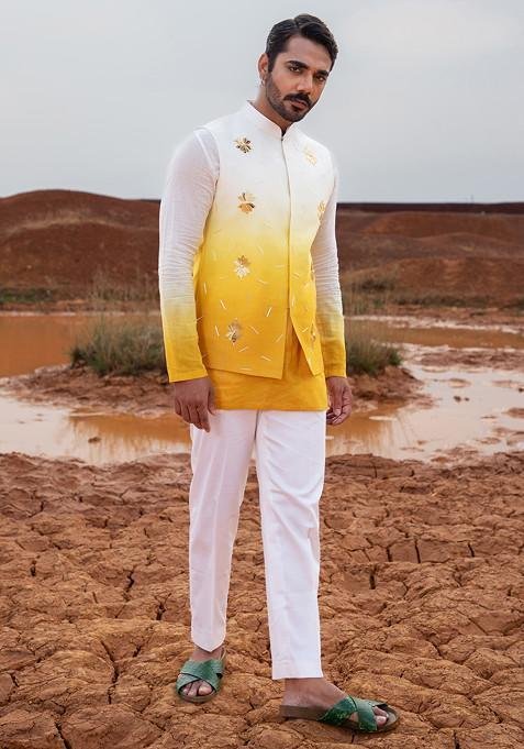 Designed to suit all body types, the Yellow Ombre Hand Embroidered Bundi Jacket Set For Men blends tradition with modern aesthetics.