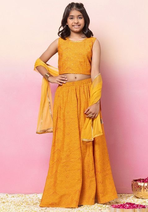 Designed to suit all body types, the Yellow Printed Lehenga With Embroidered Blouse And Mesh Dupatta (Set of 3) blends tradition with modern aesthetics.