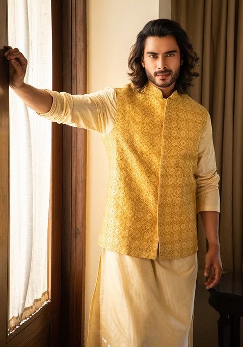 This Yellow Zari Embroidered Nehru Jacket For Men is made from premium fabrics, ensuring comfort while keeping you stylish.